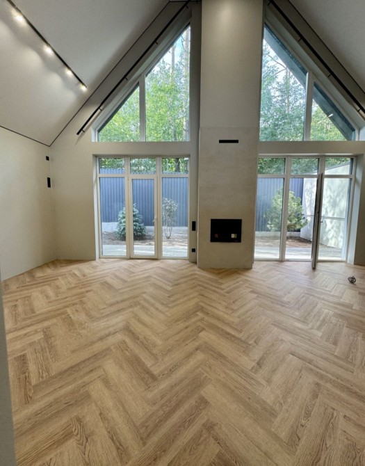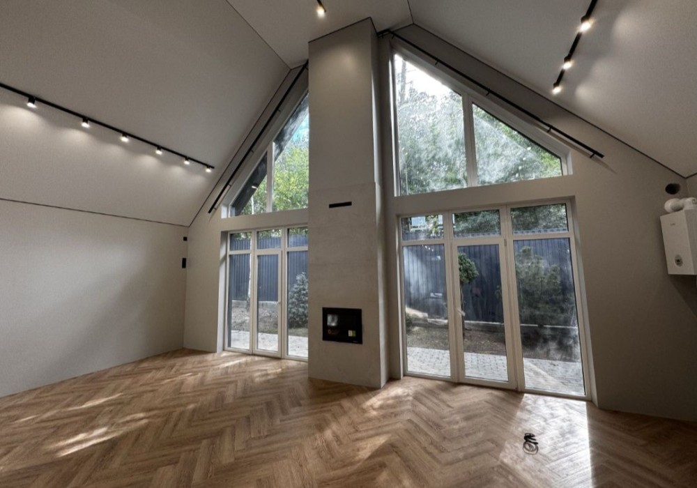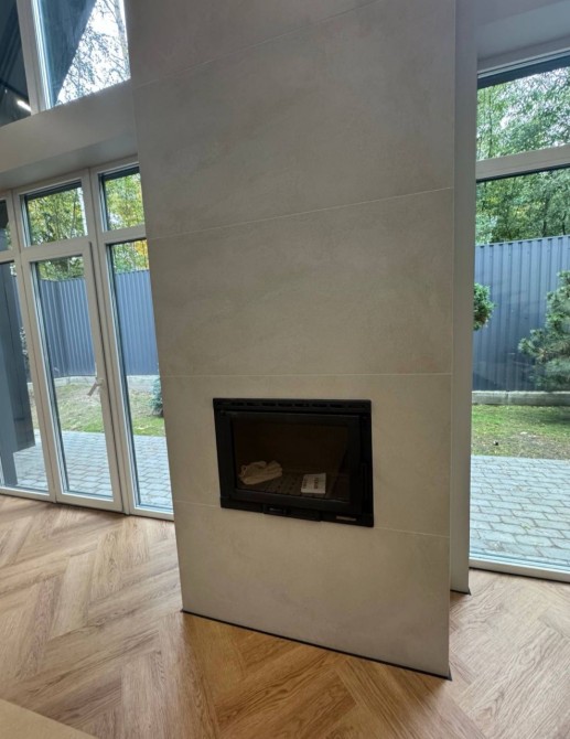 Простора кухня-вітальня з другим світлом і атмосферним дров’яним каміном