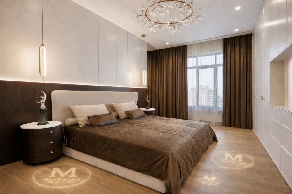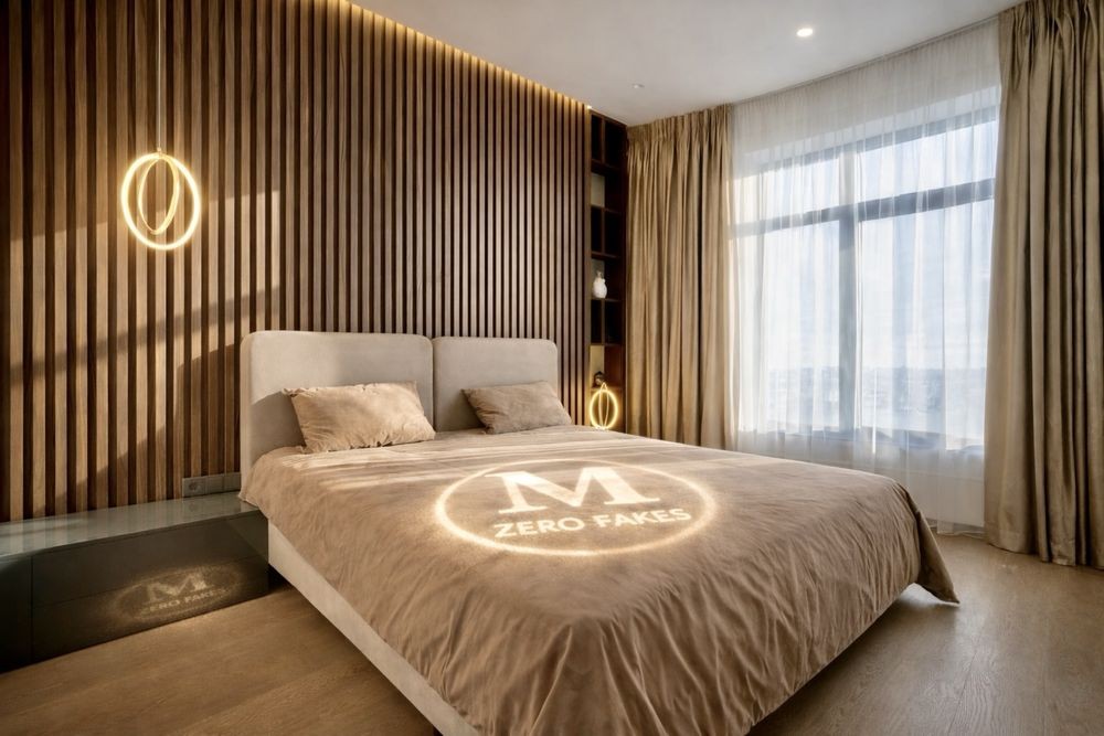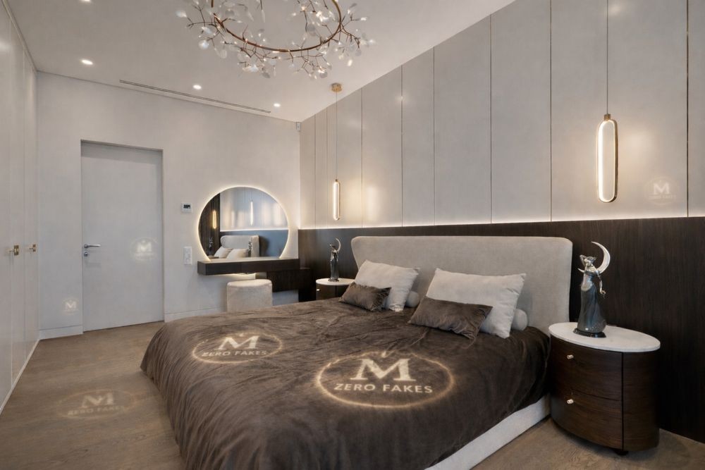 • Майстер-спальня з великим ліжком, м’якою стіновою панеллю, дизайнерським світлом