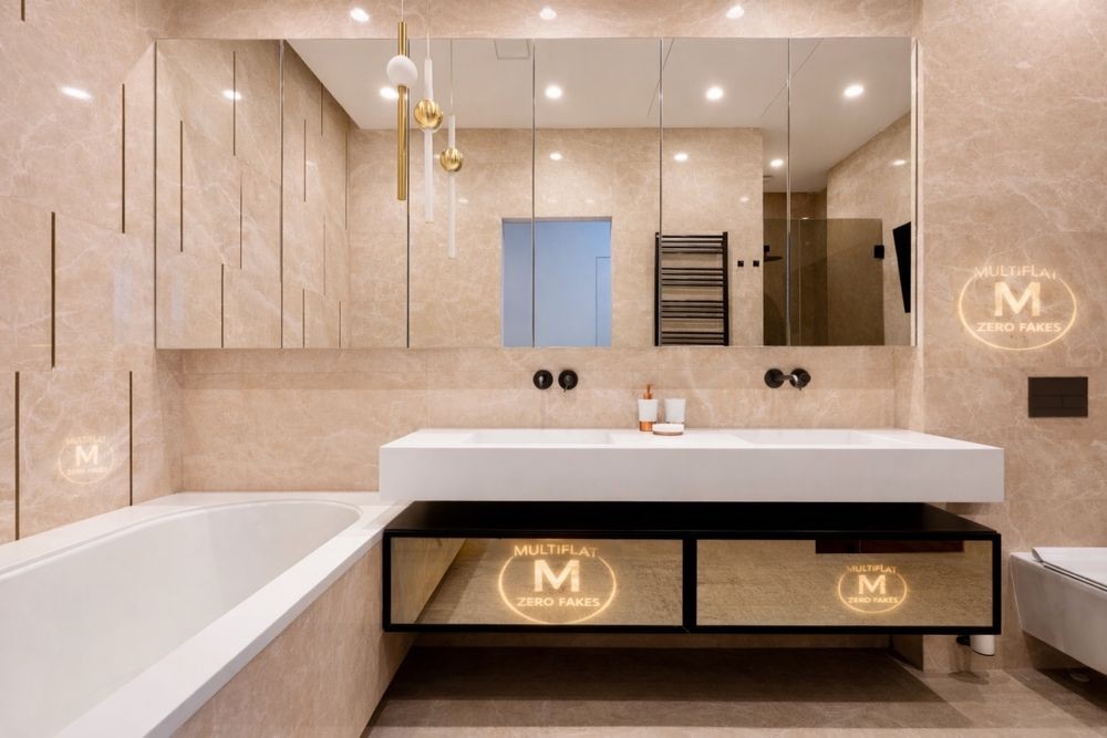 • Санвузол 1 — 9,1 м² (ванна + подовжена тумба + дизайнерські світильники)