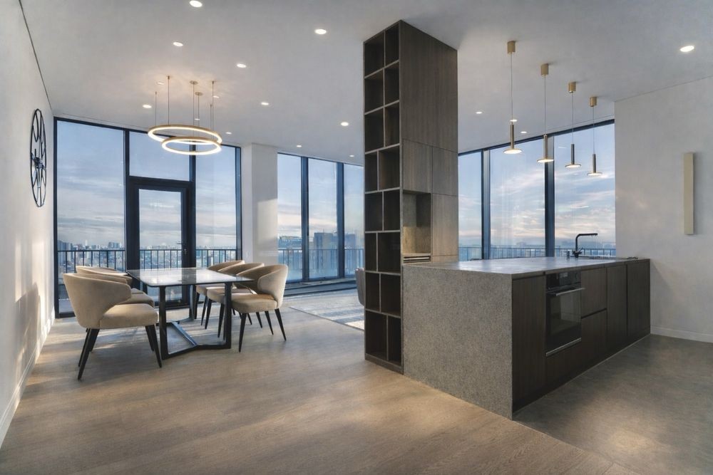 • Кухня-вітальня — простір з панорамою, островом та зоною обіду.