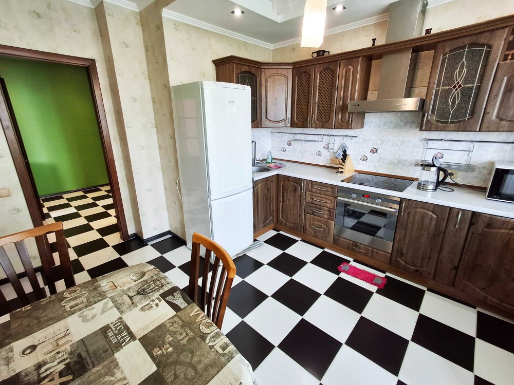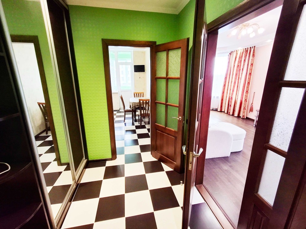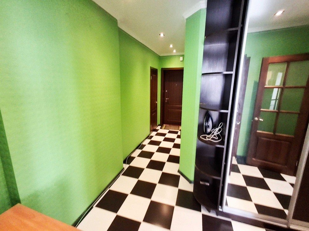 Большая комната 23,1м2 с двумя окнами и кондиционером, кухня 12м2 с застеклённой лоджией, холл 12м2 с большим зеркальным шкафом-купе и гардеробным помещением. Полностью укомплектована мебелью (большой угловой раскладной диван, шкаф-купе) и бытовой техникой (холодильник, кондиционер, индукционная варочная поверхность, большая ванна, бойлер, стиральная машина-автомат). Качественный ламинат, красивая плитка в холле, кафель в санузле, стеклопакеты. Отличное парадное. При отключении света лифты работают и водоснабжение! (Есть генератор). Фотографии реальные, свежие, делал сам. Прекрасно подойдёт и для проживания и под сдачу в аренду!