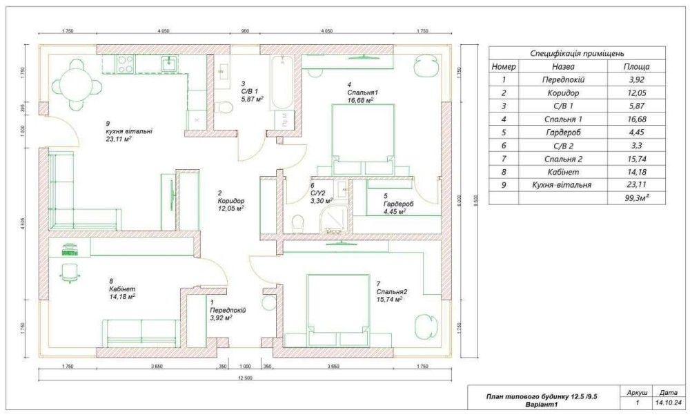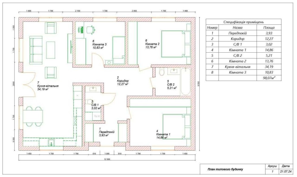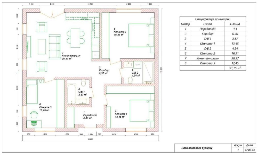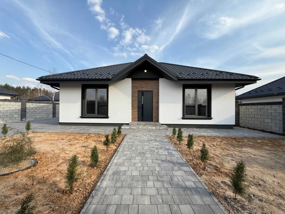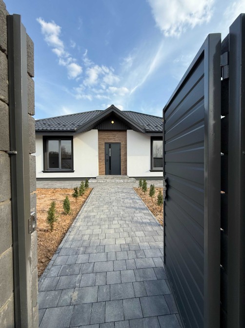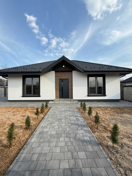 Загальна площа – 100 м2. Один поверх. У будинку 3 спальні, два с/в, кухня-вітальня.