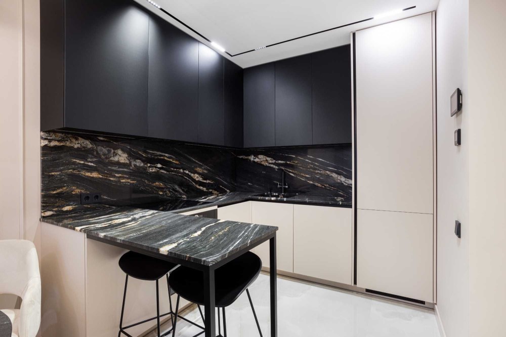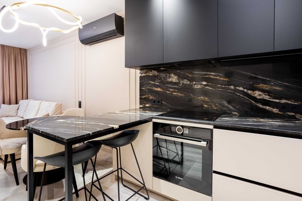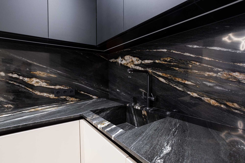 - стільниці, фартух, мийка та умивальник природний кварцит Quarzite African Fusion;