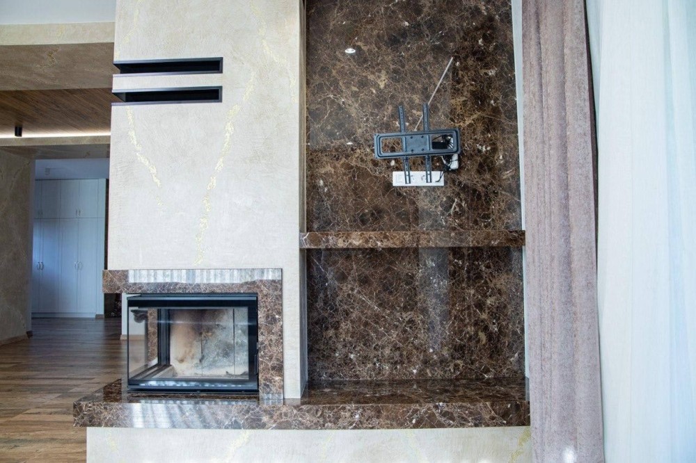 Дизайнерський інтерьер : венеціанська штукатурка у всіх кімнатах, натуральний мармур у ванних, кухні та в камінній зоні,