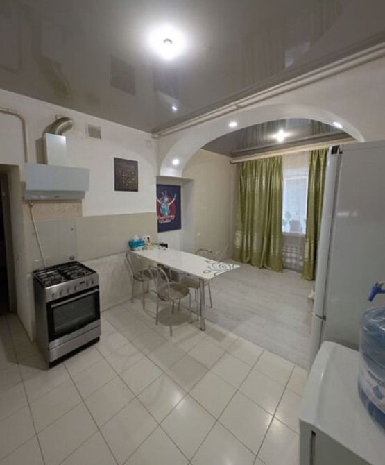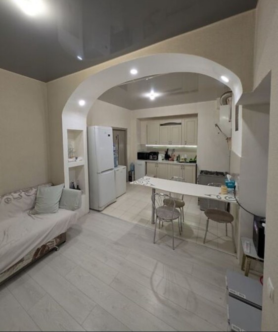 Кухня-студія сучасна, з плиткою та арочним проходом у зону відпочинку. Є обідній стіл, газова плита, витяжка, холодильник, диван. Багато місця та світла.