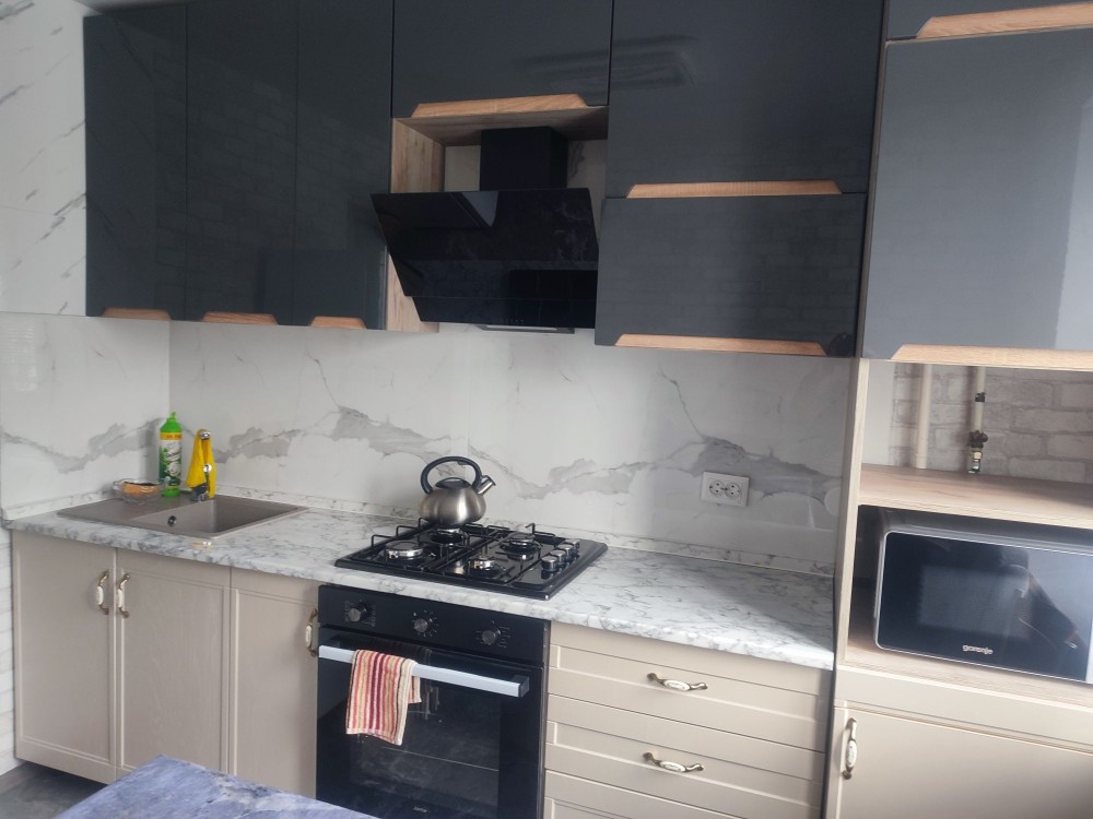 Кухня обладнана холодильником, микрохвильовою піччю, є газова варильна панель. В наявності посуд для споживання та приготування іжі.