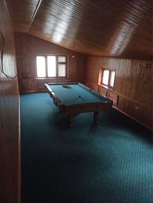 Дом 2 этажа , первый этаж : гараж, погреб , тамбур,просторный холл, кухня ,санузел,2 комнаты,камин,второй этаж:3 спальни,холл , санузел , бильярдная( стол в комплекте).