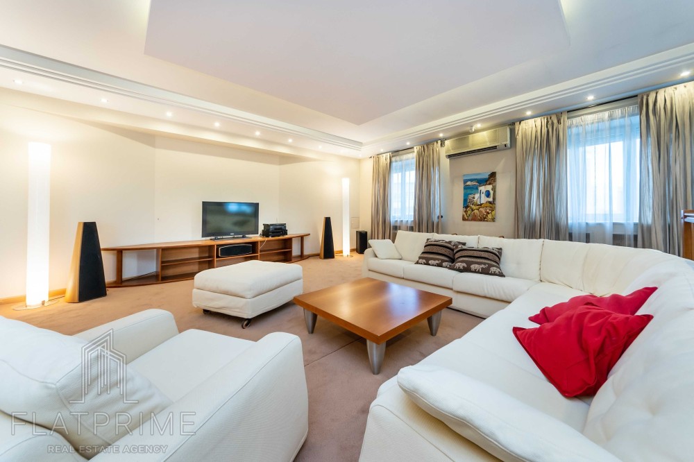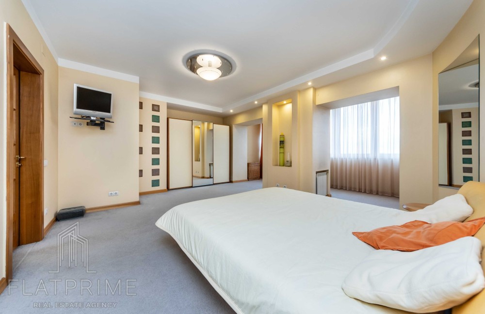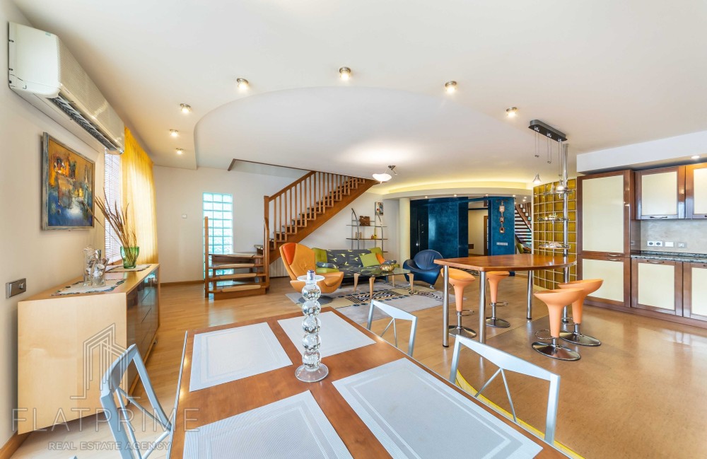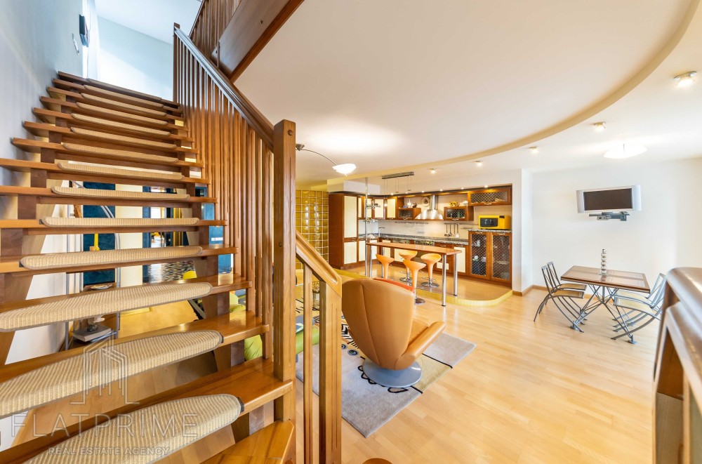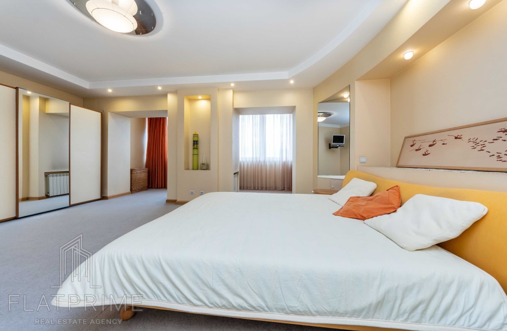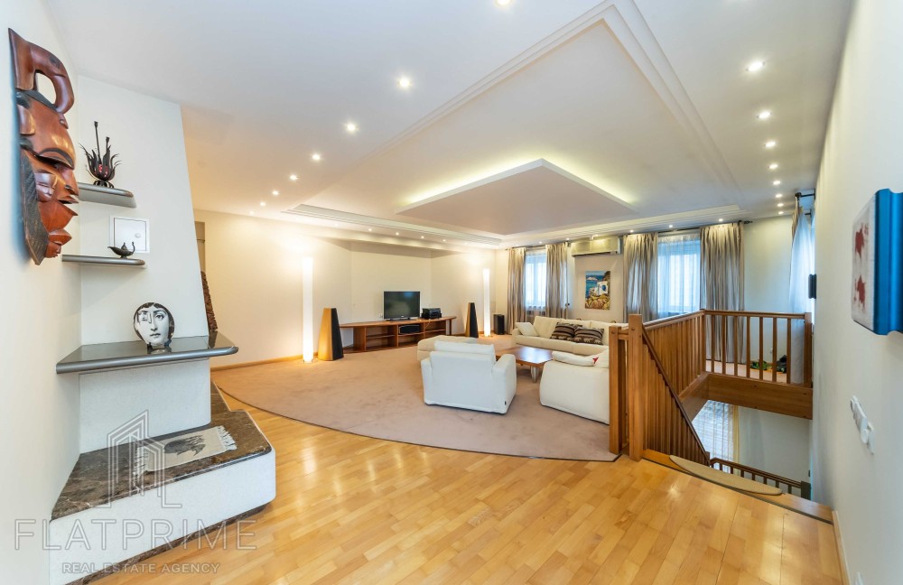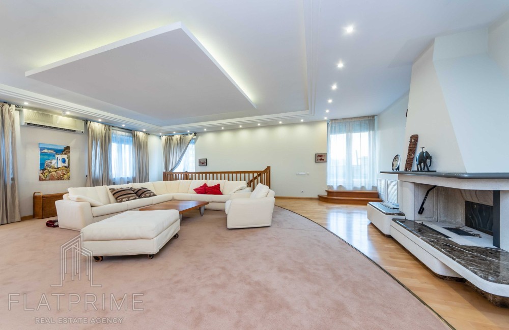 Загальна площа квартири складає 237 м2 + тераса. Авторський ремонт. Велика, світла, простора кухня-студія 60 м2, 2 спальні, кабінет, кінозал з каміном, два санвузли, сауна, дві лоджії, велика тераса на даху з власним виходом - чудовий вид. Максимальний комплект меблів та техніки.