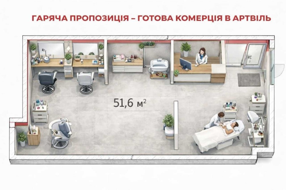 В продаже фасадное коммерческое помещение в ЖК «Артвиль». Расположено на первом этаже с общей площадью 51,6 метров квадратных в. Панорамное остекление, состояние от строителей, высота потолков 3 метра. Уже есть готовые арендаторы на Ваше помещение, готовы снимать под салон красоты. Есть генератор на случай отключения электроэнергии. Хорошо заселённый комплекс, достойный трафик.