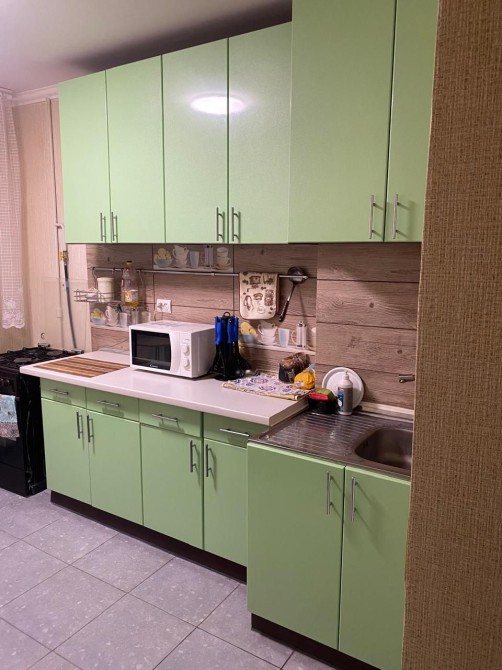 Есть холодильник, стиральная машина, микроволновка, кухонный инвентарь...