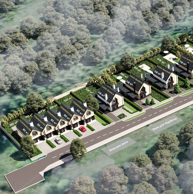 Строительство продолжается, имеются варианты домов на 140м2 и в планах строительство нескольких домиков с площадью 110м2 в единой концепции.