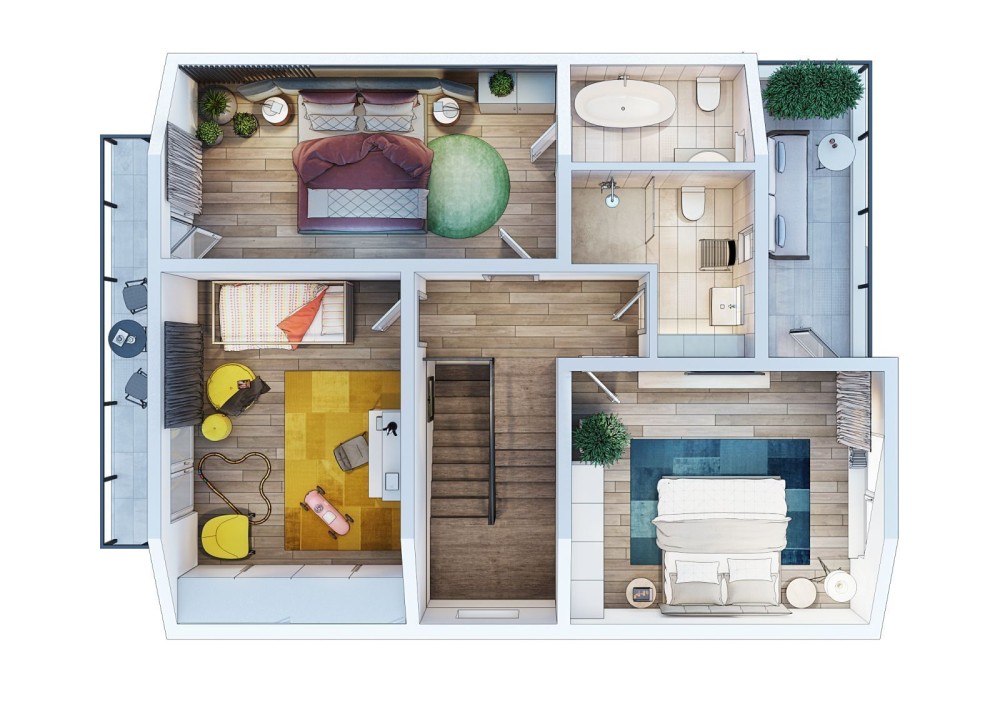 -на 2м этаже-высокие потоки добавляют воздушность, окна с углом, повторяют угол мансардного потолка