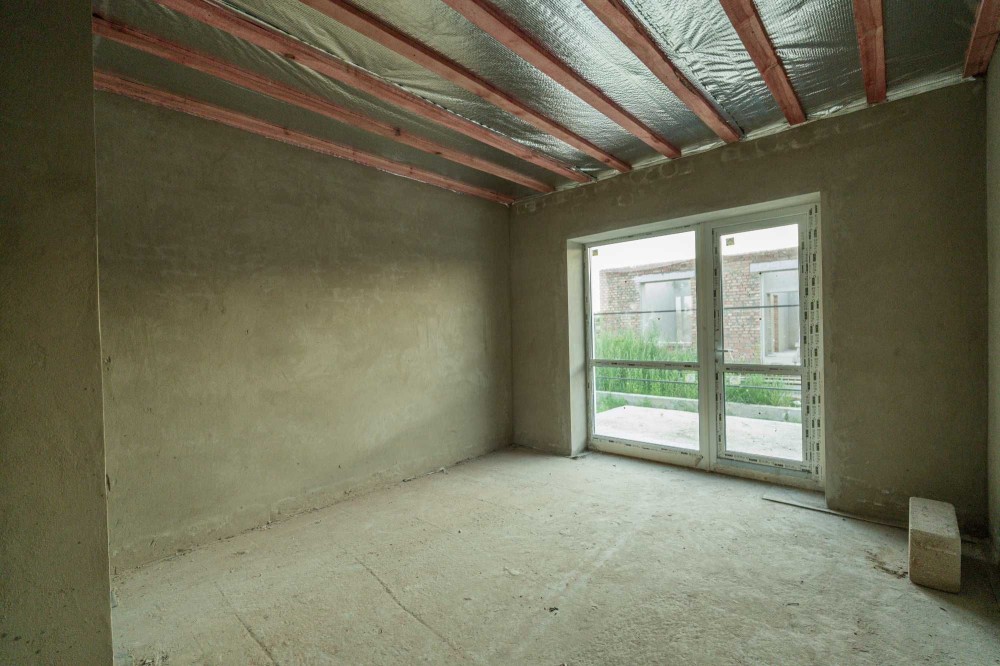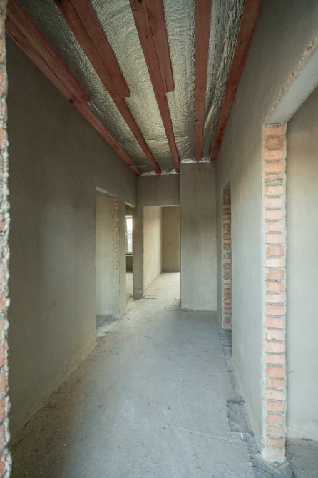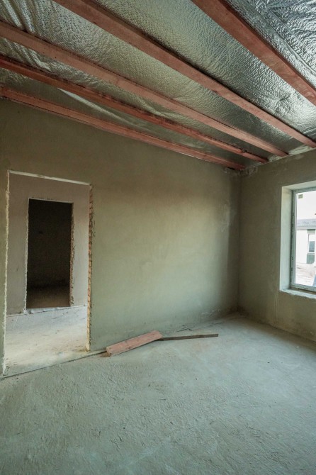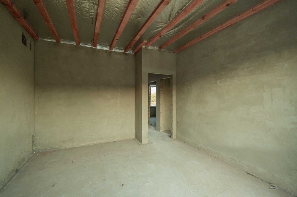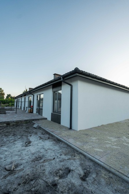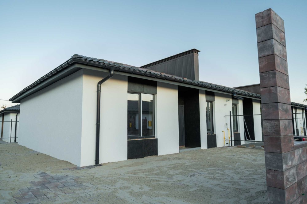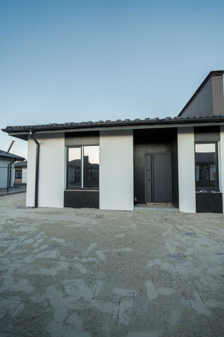 Вже виконано: фасад, дах, встановлені вікна та двері, чорнова штукатурка і чистова стяжка. Є передній і задній дворик, обмостка з бруківки, паркомісце перед будинком, ролети-ворота та мурований паркан по периметру.