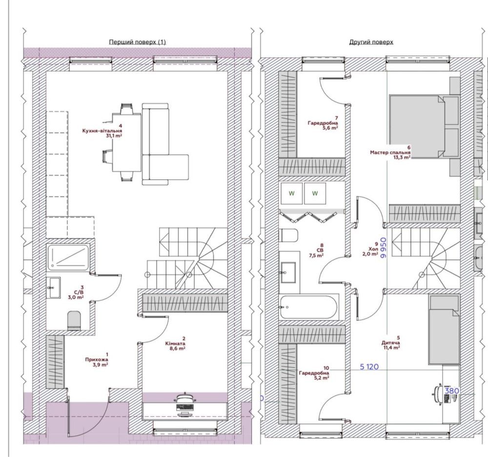 Площа — 90 м² + висока мансарда, де можна облаштувати додаткові кімнати, кабінет або зону відпочинку.