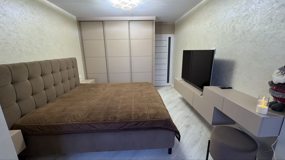 СПАЛЬНА КІМНАТА : ліжко 1,8*2 м , шафа купе під потолок 3-ох дверна ,телевізор 55 “ ,шухляди для зберігання дрібних речей.
