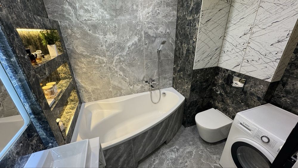 ВАННА КІМНАТА : велика ванна, пральна машина , зеркало з підсвіткою, зручні шафки та полиці.