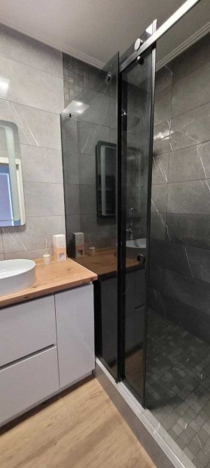 В санузле просторная душевая зона, стиральная машинка .