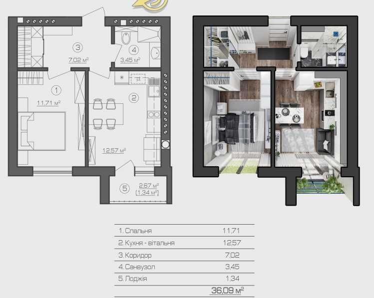 • Загальна площа 36.09 м2
