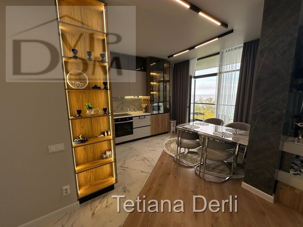 Просторная кухня-студия 26.8 кВ м с выходом на террасу с прямым видом на море.