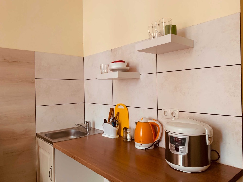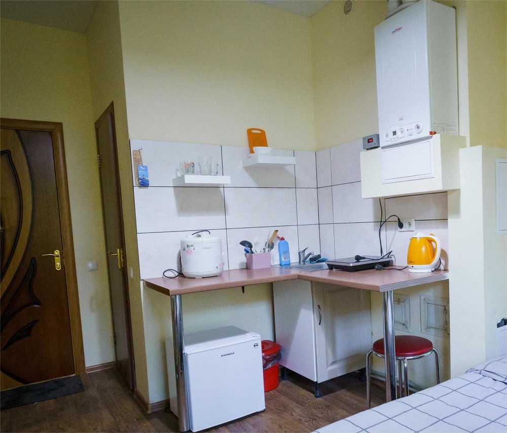 Зона кухні обладнана усією необхідною побутовою технікою і посудом: електроплита, холодильник, електрочайник, обідній стіл, посуд.