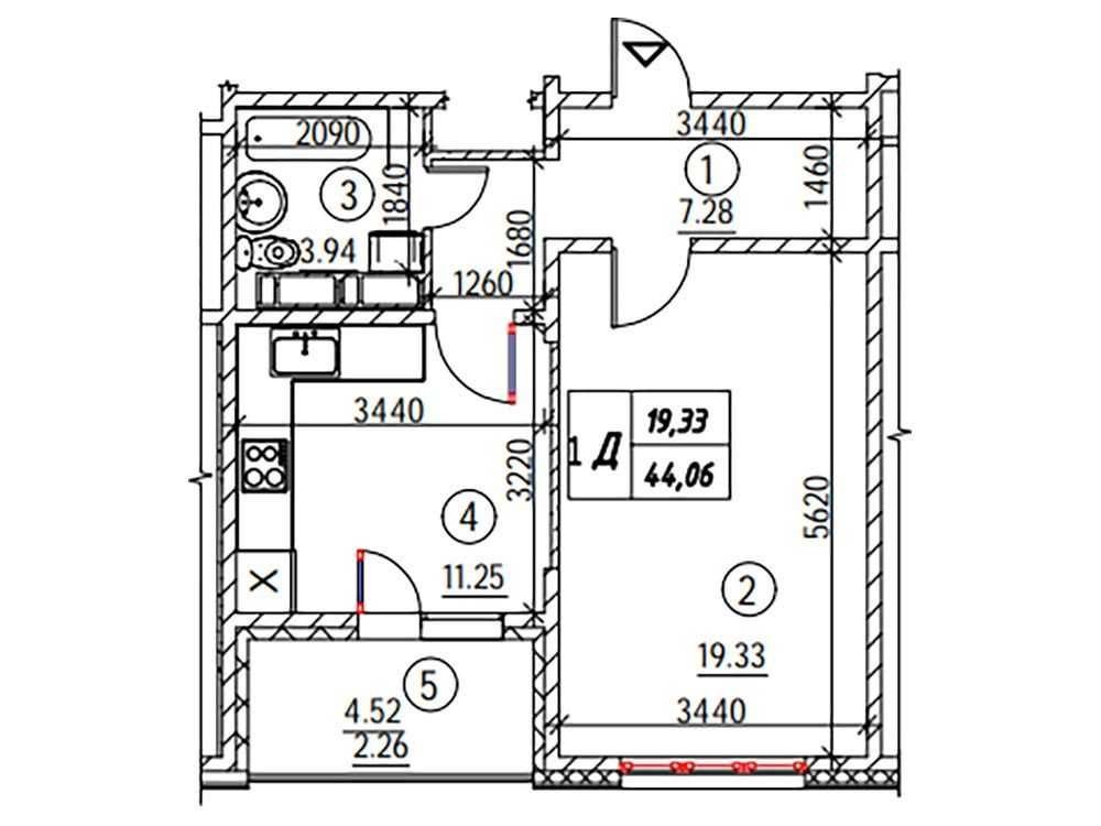 • Загальна площа: 44,06 м²