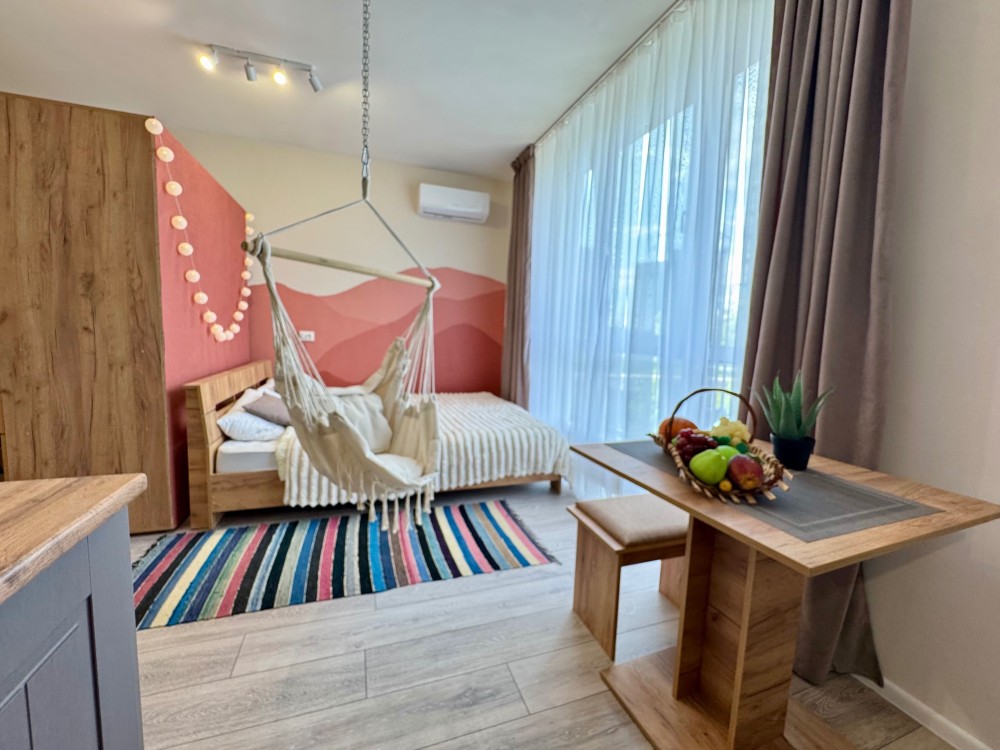 Кімната обладнана двоспальним ліжком з ортопедичним матрацом, робочим місцем, великою вмісткою шафою, кондиціонером і кріслом-гамаком для відпочинку. Є також прасувальна дошка і пилосос.