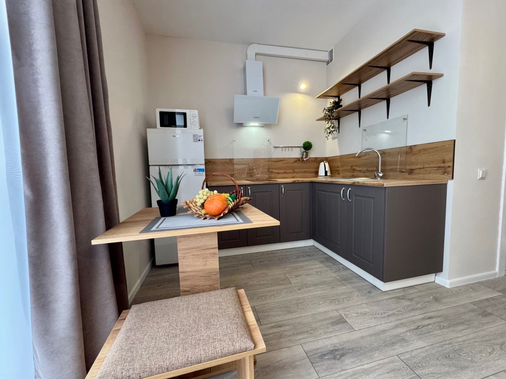 Зона кухні оснащена всім необхідним для приготування страв - варильна панель без духовки, мікрохвильова піч, холодильник, електрочайник, мийка, витяжка, обідній стіл із стільцем.