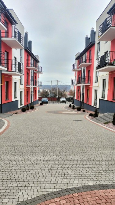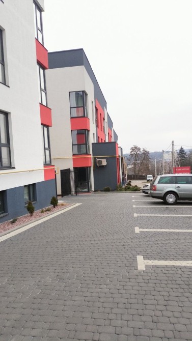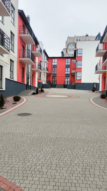 велика кухня-студія 17,5м2, кімната з 2-ма вікнами, що дає змогу легко розділити на 2 кімнати, просторий санвузол і коридор.