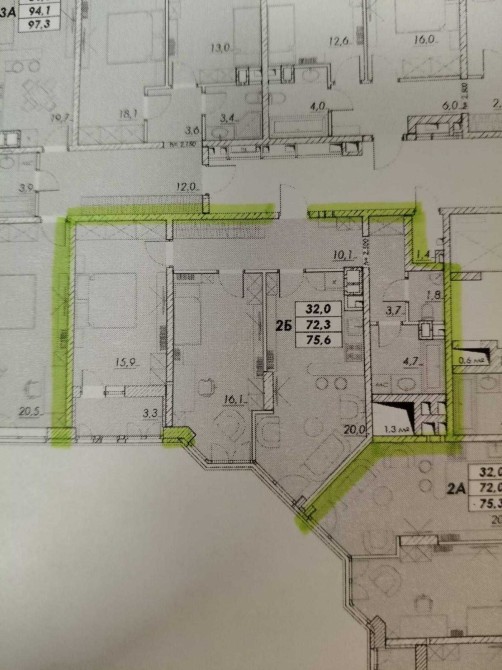 Общая площадь - 75.6 метров, 2 спальни - 16.1 + 15.9, кухня - столовая - 20, 2 с/у - 4.7 + 1.8, коридор - 10.1, лоджия - 3.3. Состояние от строителей.