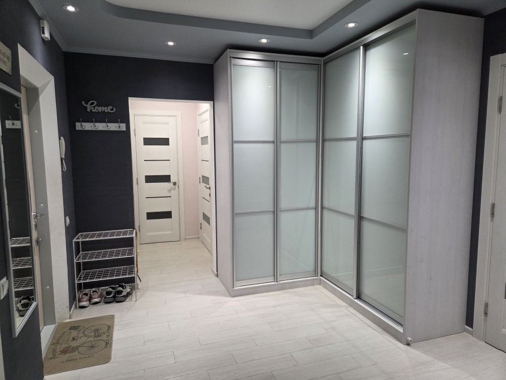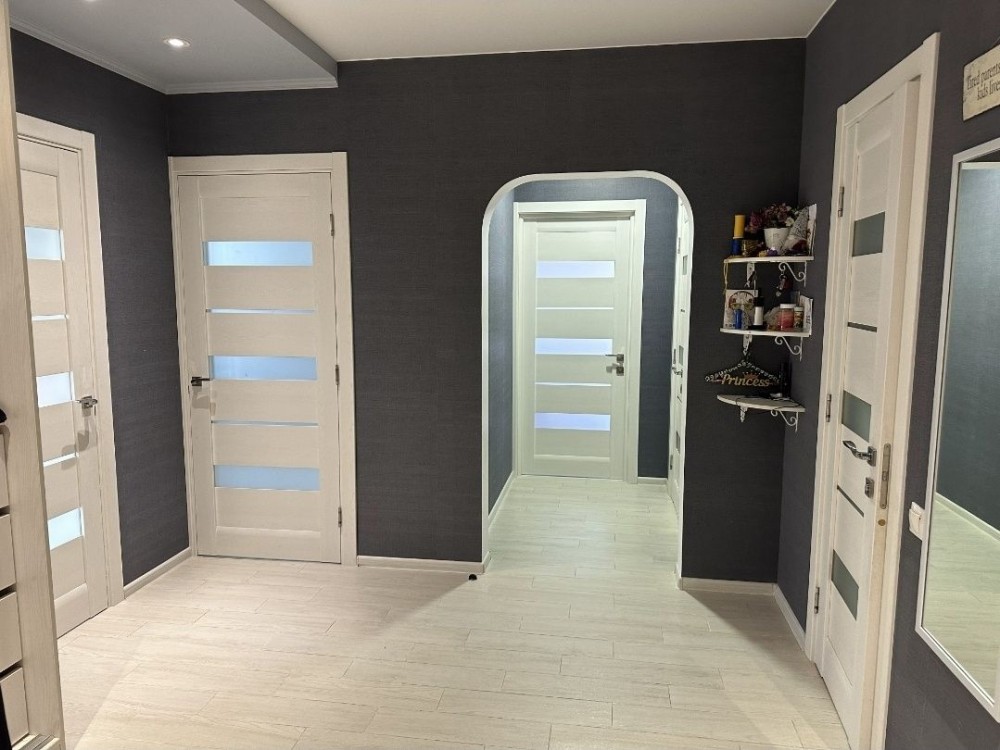 Планування: 3 окремі кімнати по 17 м.кв., просторий коридор ( 15 м) з вбудованими шафами , засклений утеплений балкон з зоною для відпочинку та шафою, ванна і туалет роздільні.