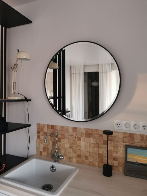 - кухня зі стільницею з натурального дерева липи, вбудована побутова техніка, холодильник, острівна витяжка, керамічна раковина