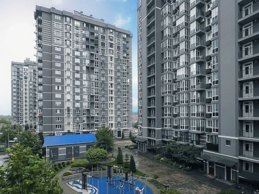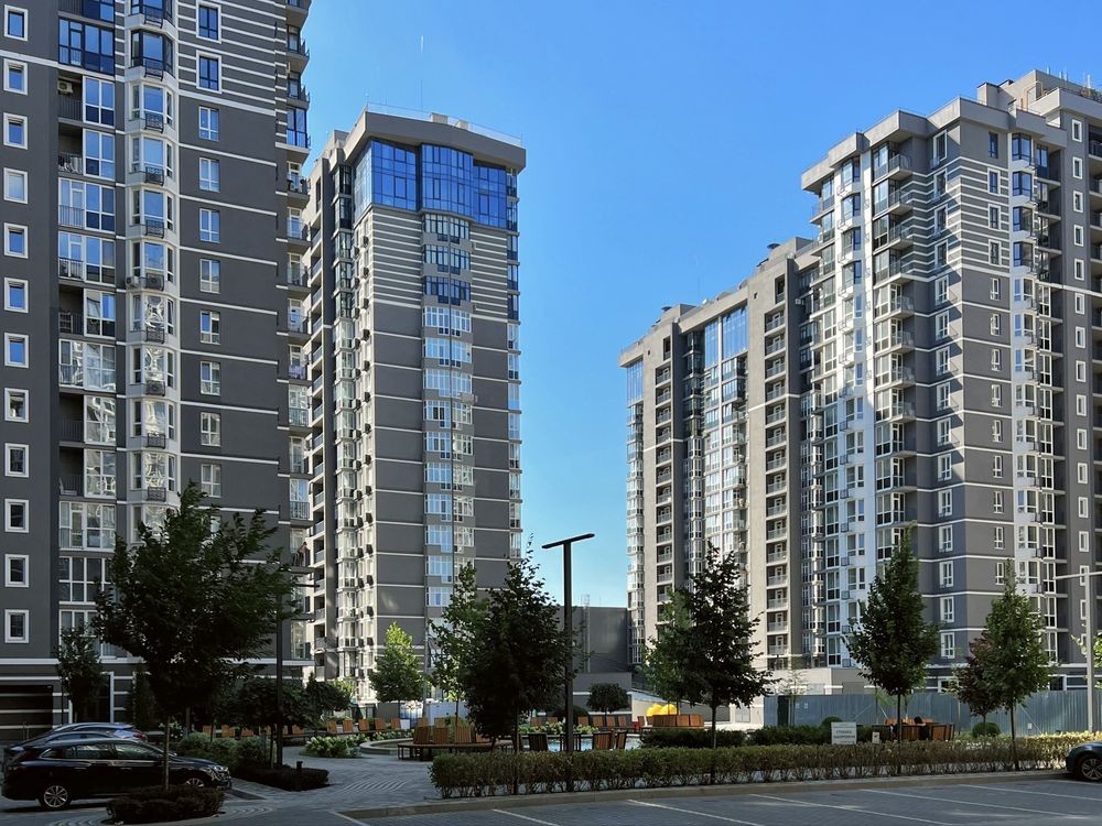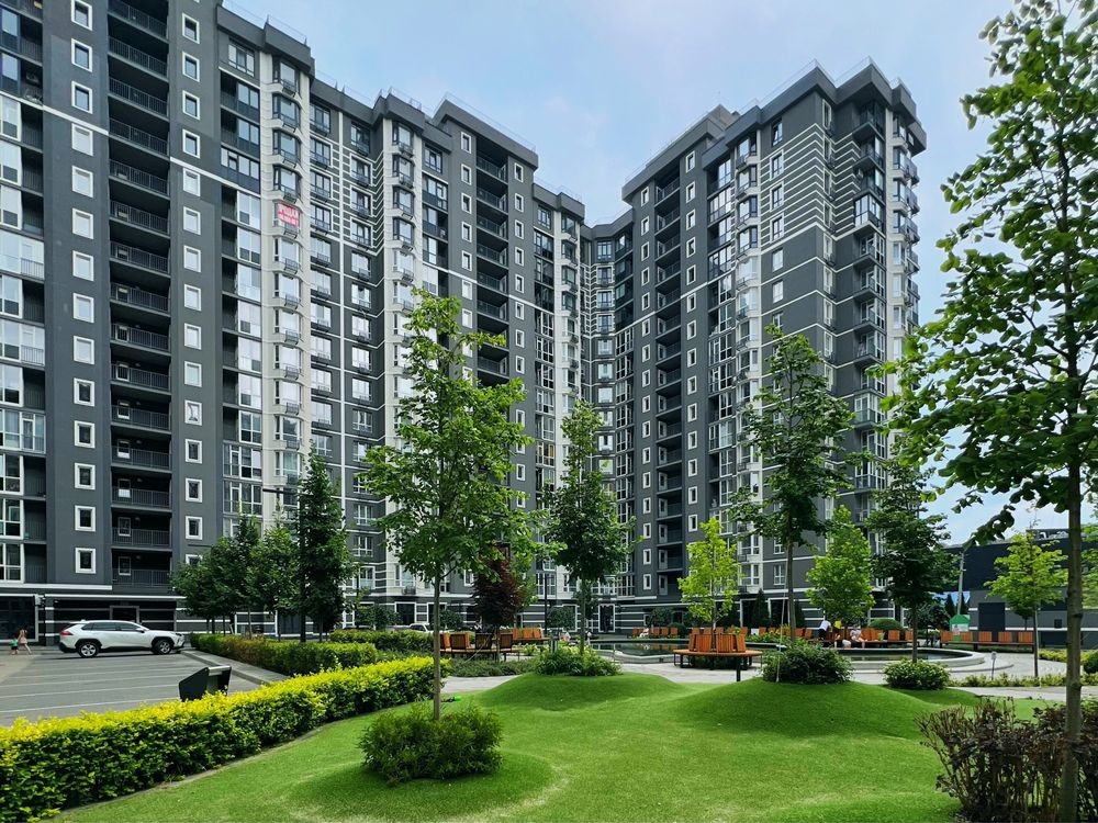 сучасний будинок із швидкісними ліфтами та підземним паркінгом.