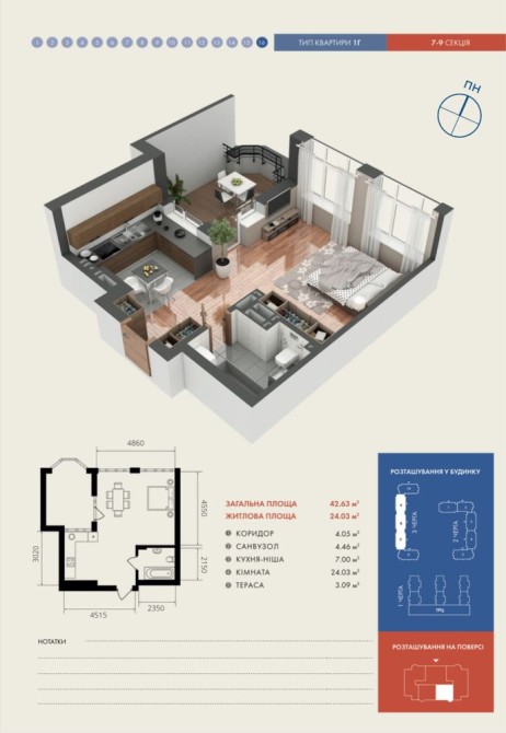 Площа квартири: 43м² .