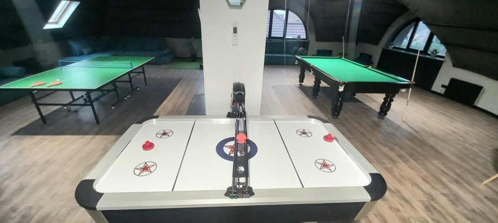 На горищі ігрова 100 квадратних метрів з більярдом, теніс, аєрохокей, бігова доріжка, камін, кабінет та кінотеатр і з санвузлом на поверсі.