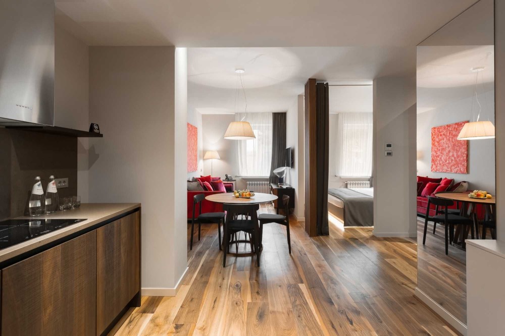 Розділено на спальну та гостьову зони, оснащені індивідуальною кухнею, в якій є все необхідне для приготування. Вбиральні та санвузлом. Ідеально підходить для сімейного проживання.