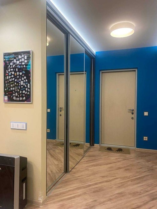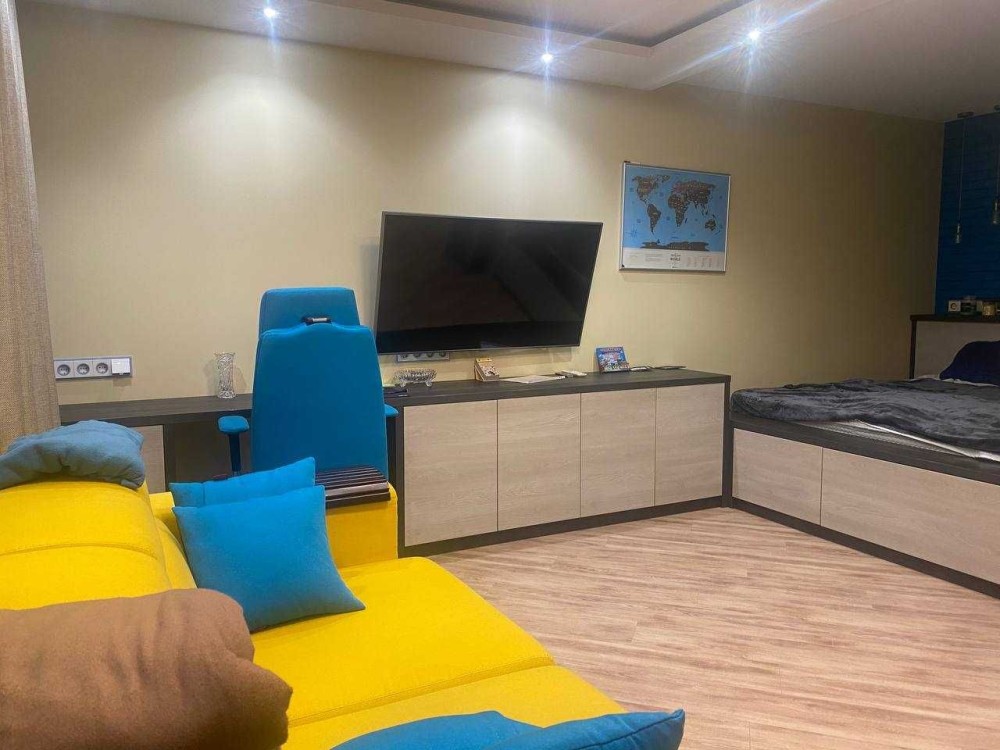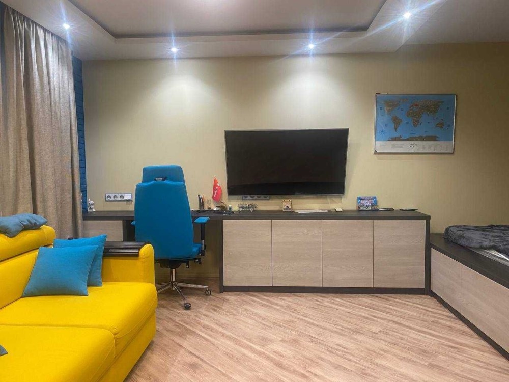 Всі меблі під замовлення (шпон+покраска, фурнітура Blum). Дві кафи-купе (3+2 двері), кровать на подіумі 180*200 (багато корисного місця під ламелями), тумбочки під телевізором, розкладний диван на 2 місця.