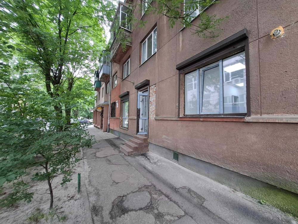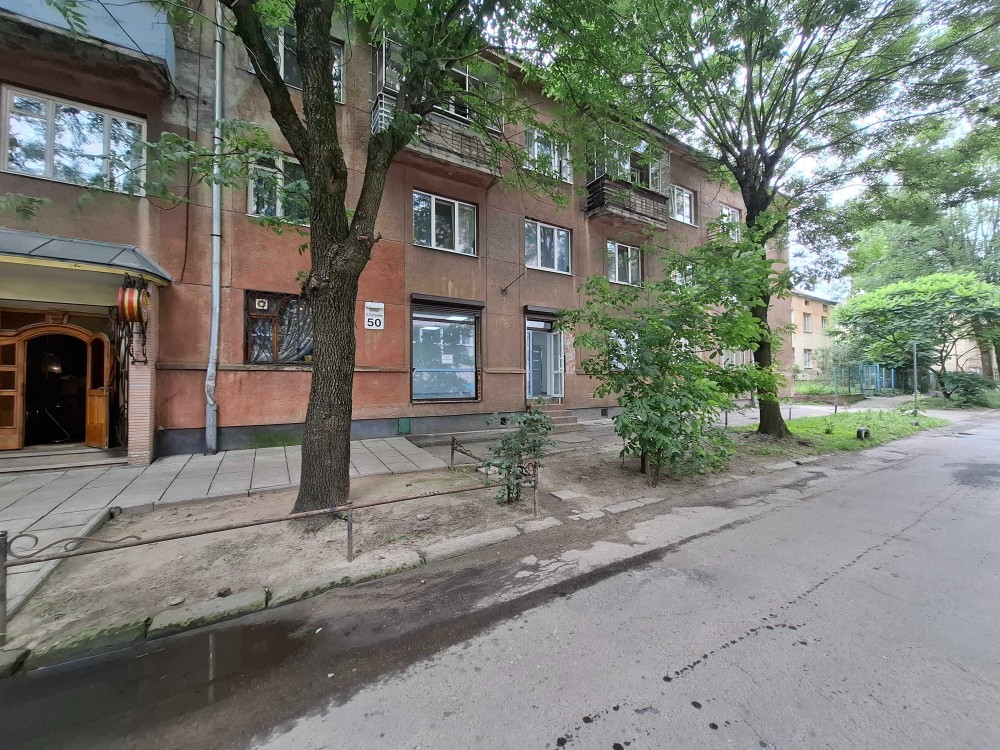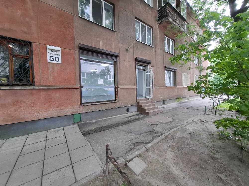 Магазин - офіс на вул. Олени Степанівни 50 . Фасадний вхід, фасадні вітрини. Є ще один вхід з іншої сторони будинку (можливо під розвантаження продукції).