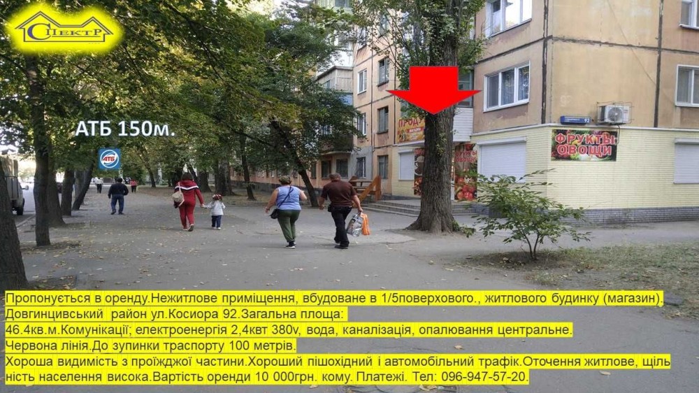 Пропонується в оренду.Нежитлове приміщення, вбудоване в 1/5поверхового., житлового будинку (магазин).Довгинцивський  район ул.Косиора 92.Загальна площа: 46.4кв.м.Комунікації; електроенергія 2,4квт 380v, вода, каналізація, опалювання центральне.
