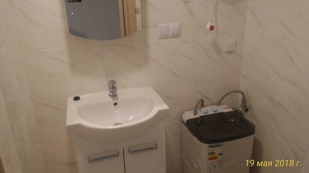 Комплектация бытовой техникой: телевизор, холодильник, электро чайник, СМА,микроволновая печь, кондиционер, стол, два стула, гладильная доска, утюг.