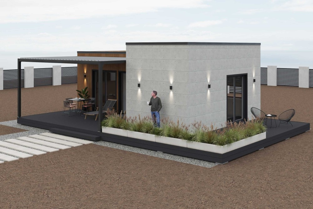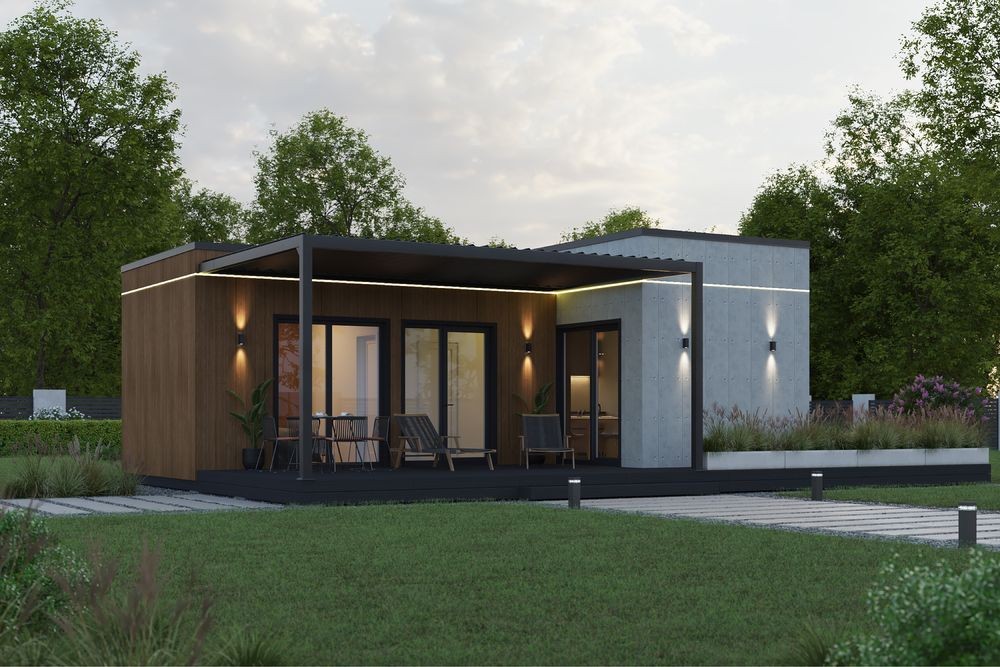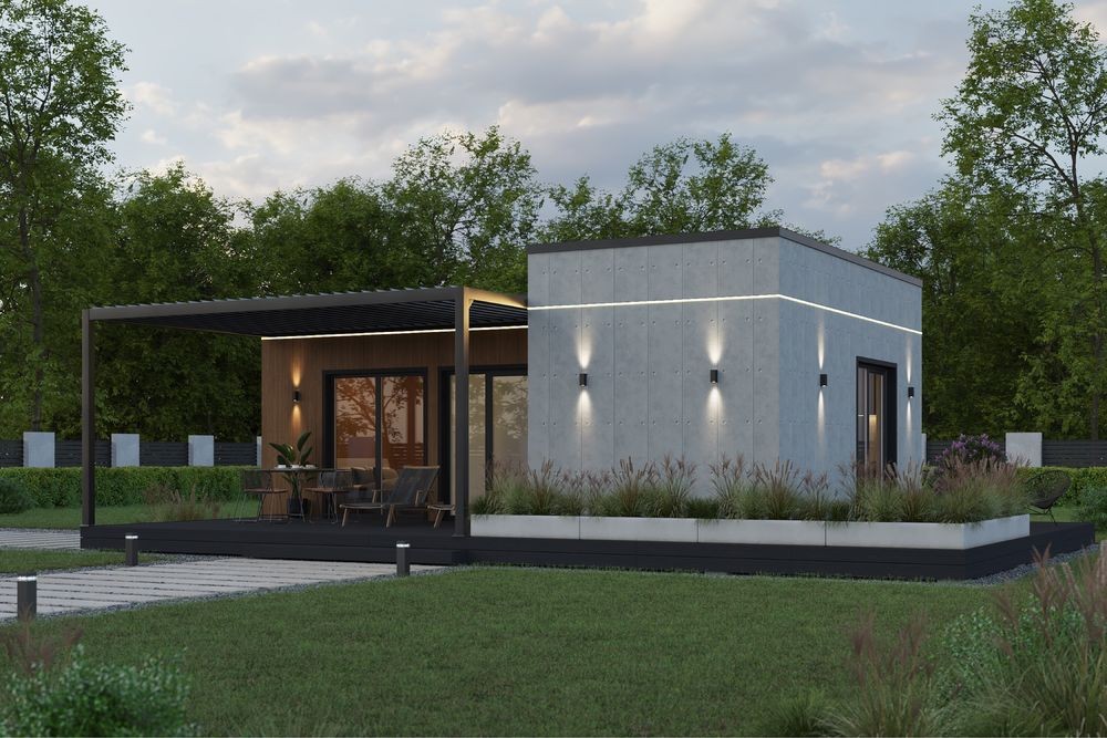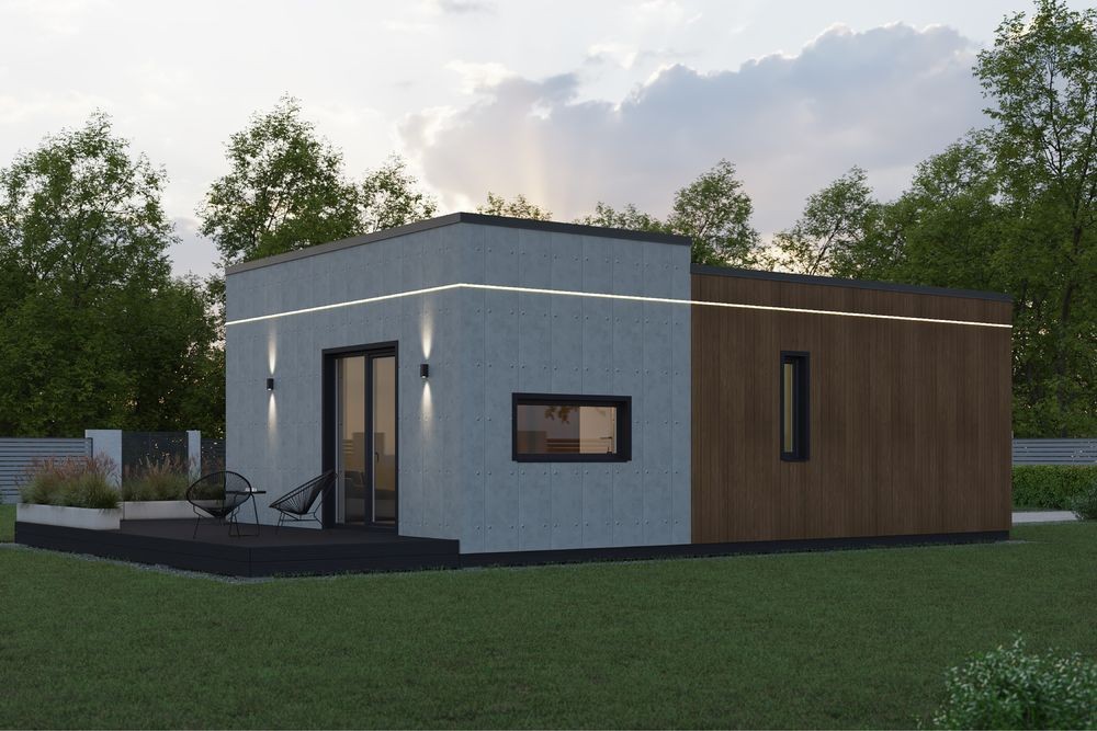 Сучасний модульний будинок, зібраний на базі міцного металевого каркасу та облицьований фіброцементними панелями NICHIHA (Японія) — якісне,