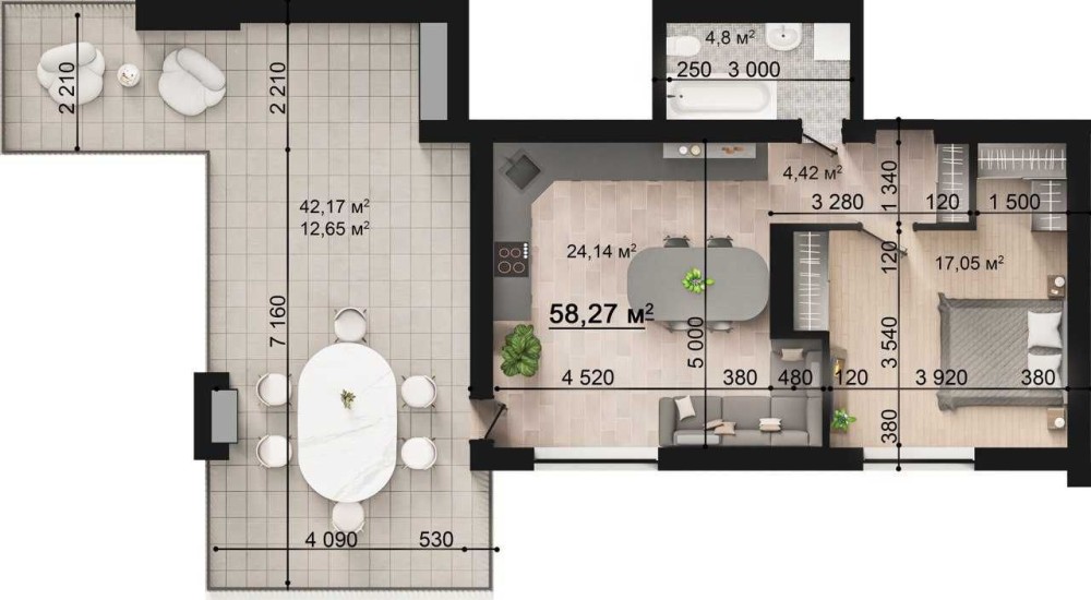 Площа квартири 58,27 м2. Авторське планування з неймовірною терасою 12,65 м2