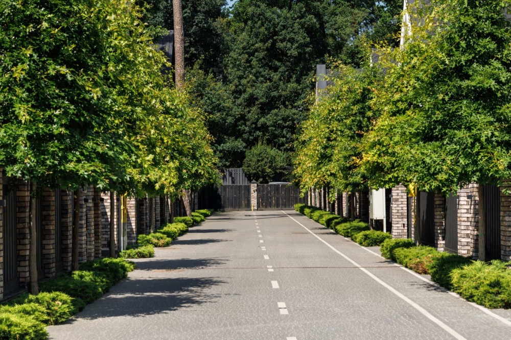 Закрита зелена територія з широкими вулицями та дитячим майданчиком.