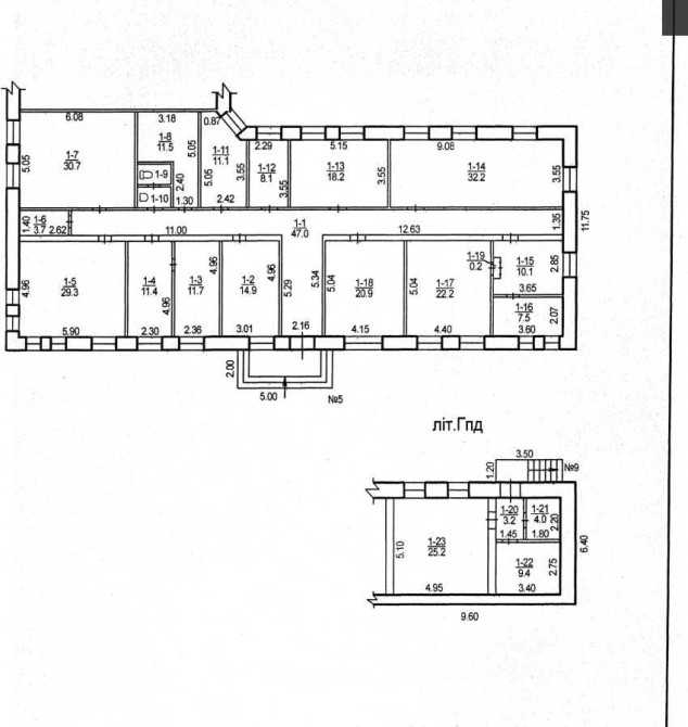 Нежитлові приміщення частини підвалу та І поверху в будівлі за літ. Г-1 площа 336,1 м2