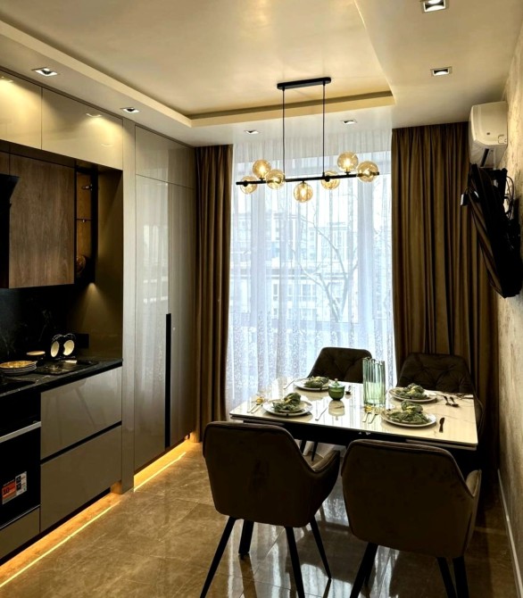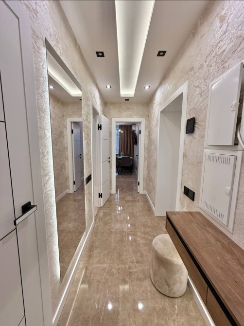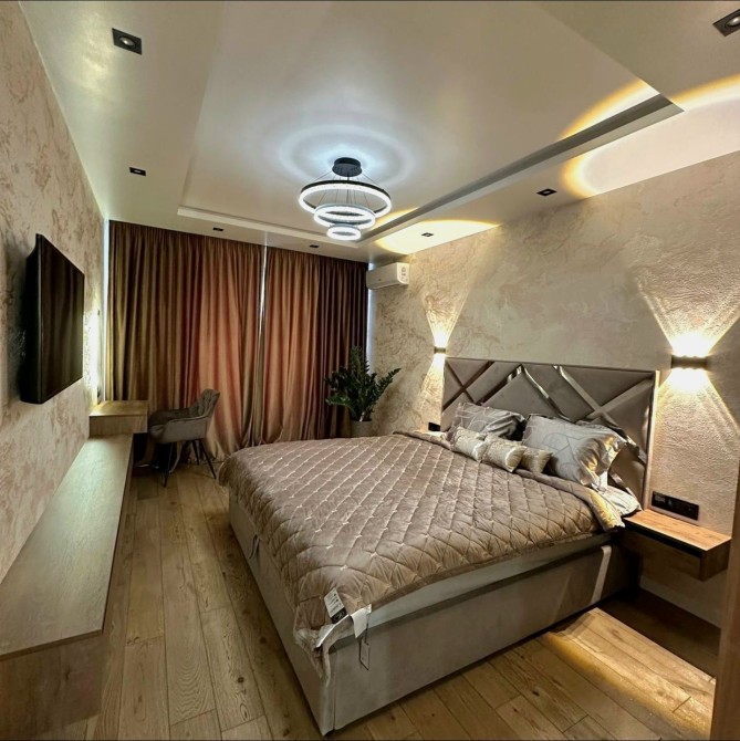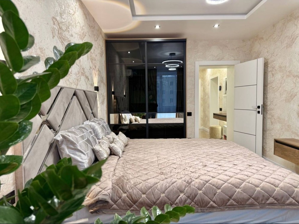 Квартира повністю укомплектована меблями: двоспальне ліжко, навісні приліжкові тумби, велика шафа, підвісні шафи, гардеробна, обідній стіл та 5 стільців, пуф, дзеркала з підсвіткою.