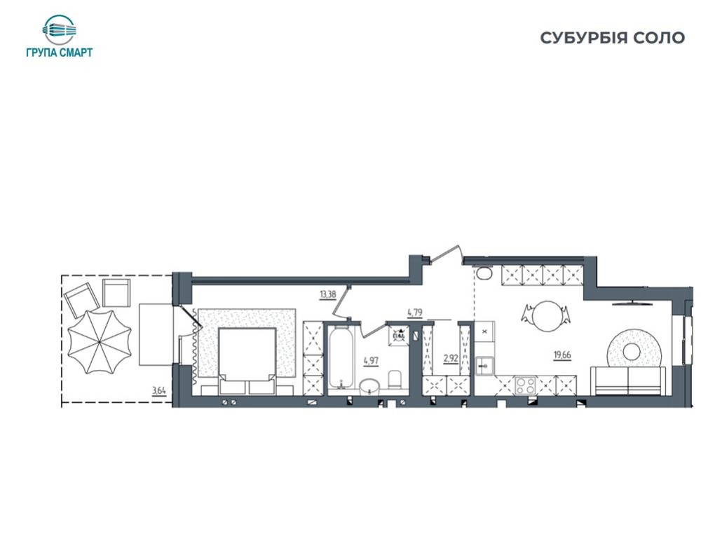Площа – 49,36 м² + власна патіо-ділянка для відпочинку чи барбекю.