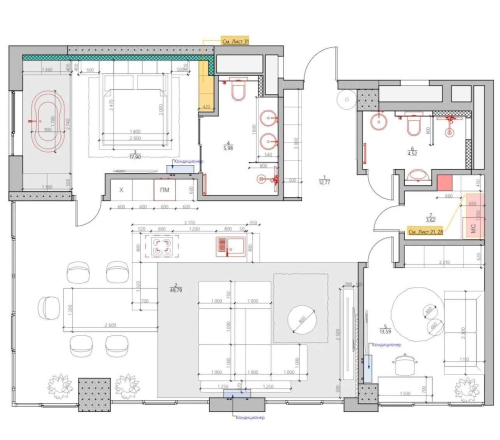 Кухня гостиная , мастер спальня, комната свободного использования, гардероб, гостевой сан узел.