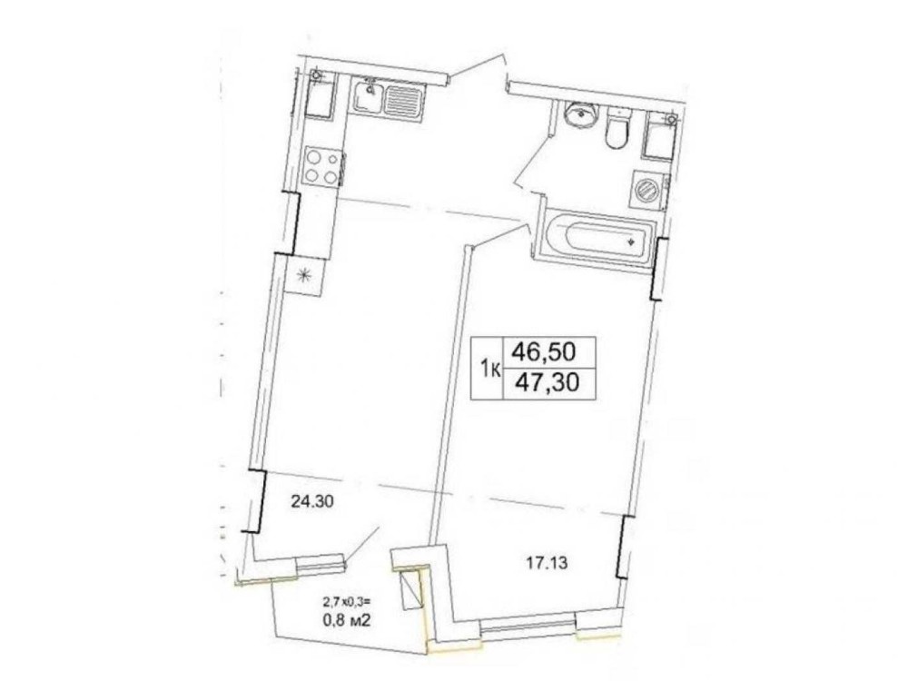Загальна площа - 47м², кухня - 24 м².
