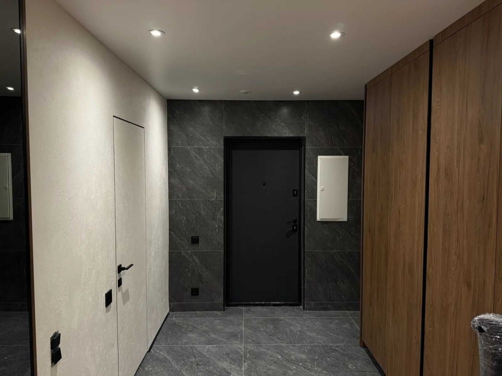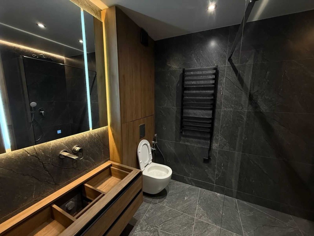 Встановлені двері прихованого монтажу, по всій квартирі змонтована тепла підлога. Санвузол обладнаний сантехнікою прихованого монтажу, що додає інтерʼєру лаконічності та сучасності.