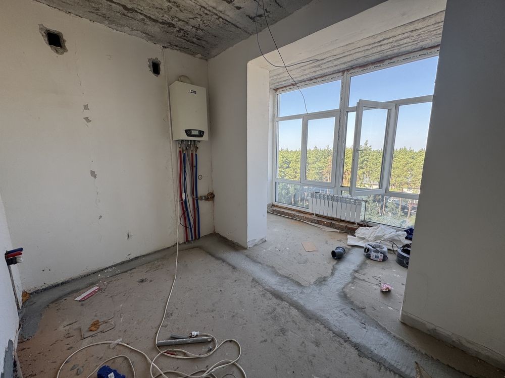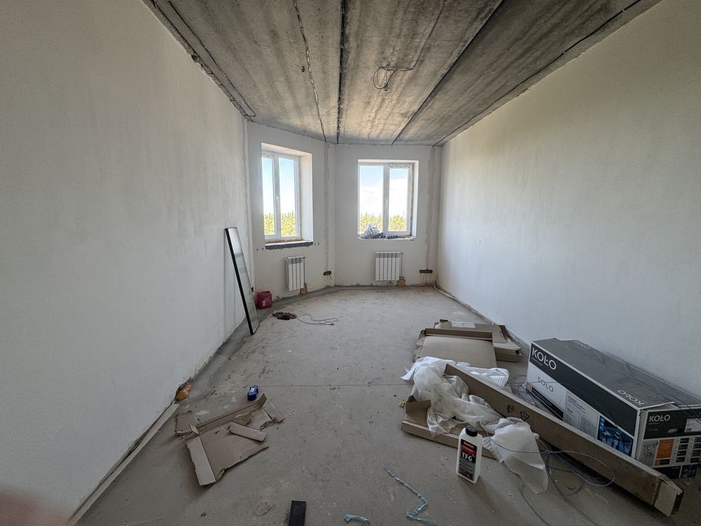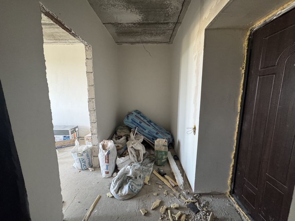 Зроблена вже штукатурка стін , стяжка підлоги , розведена сантехніка та електрика.