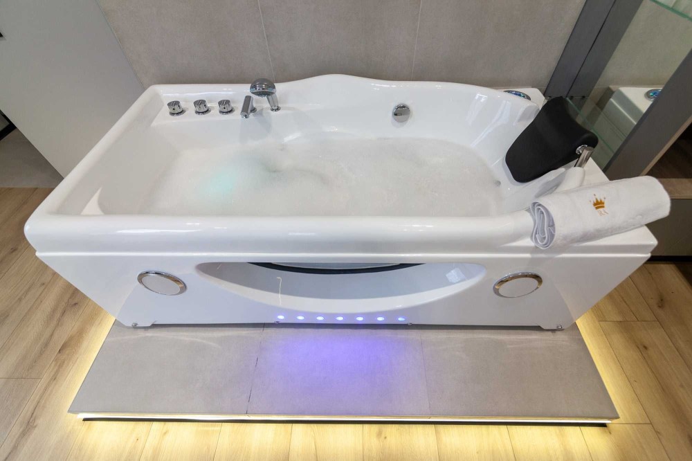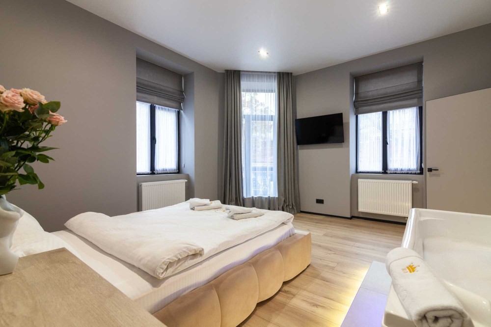 У квартирі є окрема затишна спальня з великим двоспальним ліжком та джакузі , також вихід на балкон, де можна насолодитися ранковою кавою або вечірнім повітрям— чудове місце для відпочинку та релаксу.
